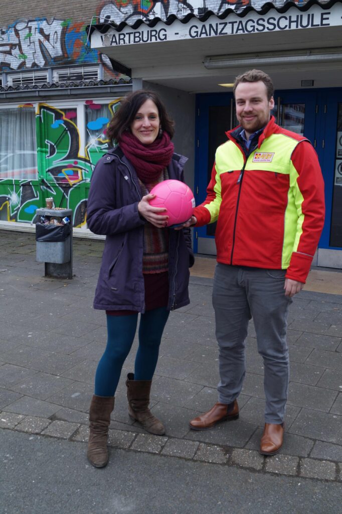 Seit Ende Februar dient die ehemalige Wartburg-Schule als Erstaufnahmeeinrichtung des Landes NRW für Flüchtlinge. Doch viel zum Spielen ist für die Kinder noch nicht vorhanden. Der Kreisverband der Grünen in Münster sammelte in einer privaten Spendenaktion nun genügend Geld um 16 Fußbälle anzuschaffen. Diese wurden am letzten Freitag offiziell an der Wartburg-Schule an die Verantwortlichen übergeben.