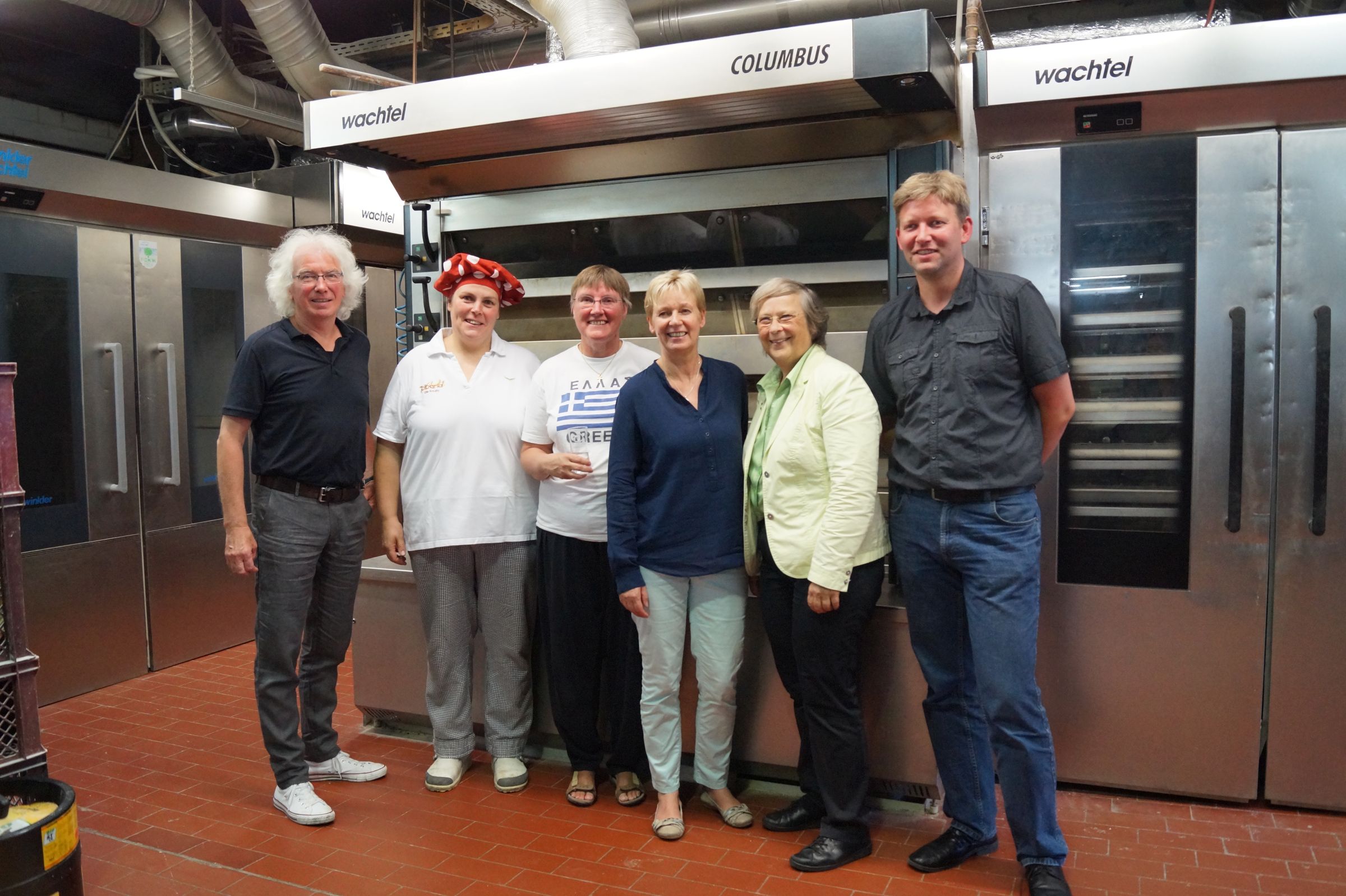 Besuch bei cibaria. Von l. nach r.: Grünen-Mitglied W.Breitenbach, Bäckermeisterin U.Kaulitz, Geschäftsführerin R. Kappler, M. Klein-Schmeink, B. Höhn, Grünen-Vorstandsmitglied T. Möller