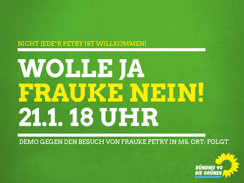 Die Münsteraner Grünen erklären dazu gemeinsam: „Für Hass und Hetze ist kein Platz in Münster! Zeigen wir als Stadtgesellschaft am Donnerstag Gesicht für ein buntes und weltoffenes Münster und gegen dumpfe Parolen und rassistische Hetze! Frauke Petry hat nicht zuletzt durch ihren Schulterschluss mit der PEGIDA-Bewegung gezeigt, dass die AFD eine rechte Partei ist, die gewalttätigen und organisierten Nazis eine Plattform bietet. Wir sind uns sicher, dass die Münsteraner*innen erneut zeigen werden, dass sie sich mit Nachdruck gegen eine Stimmung der Angst und Panikmache stellen, wie sie die AFD z.B. in der Flüchtlingsdebatte befördern will.