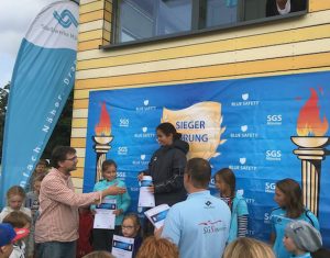 Anläßlich der Stadtmeisterschaften im Schwimmen am 03.09.2017 im Freibad Coburg: Klaus Rosenau, Ratsmitglied und sportpolitischer Sprecher der GRÜNEN zusammen mit dem Vorstandsvorsitzenden der SGS, Paul Albers, bei der Siegerinnenehrung der Mädchen, 50 m Brust, Jahrgang 2008.