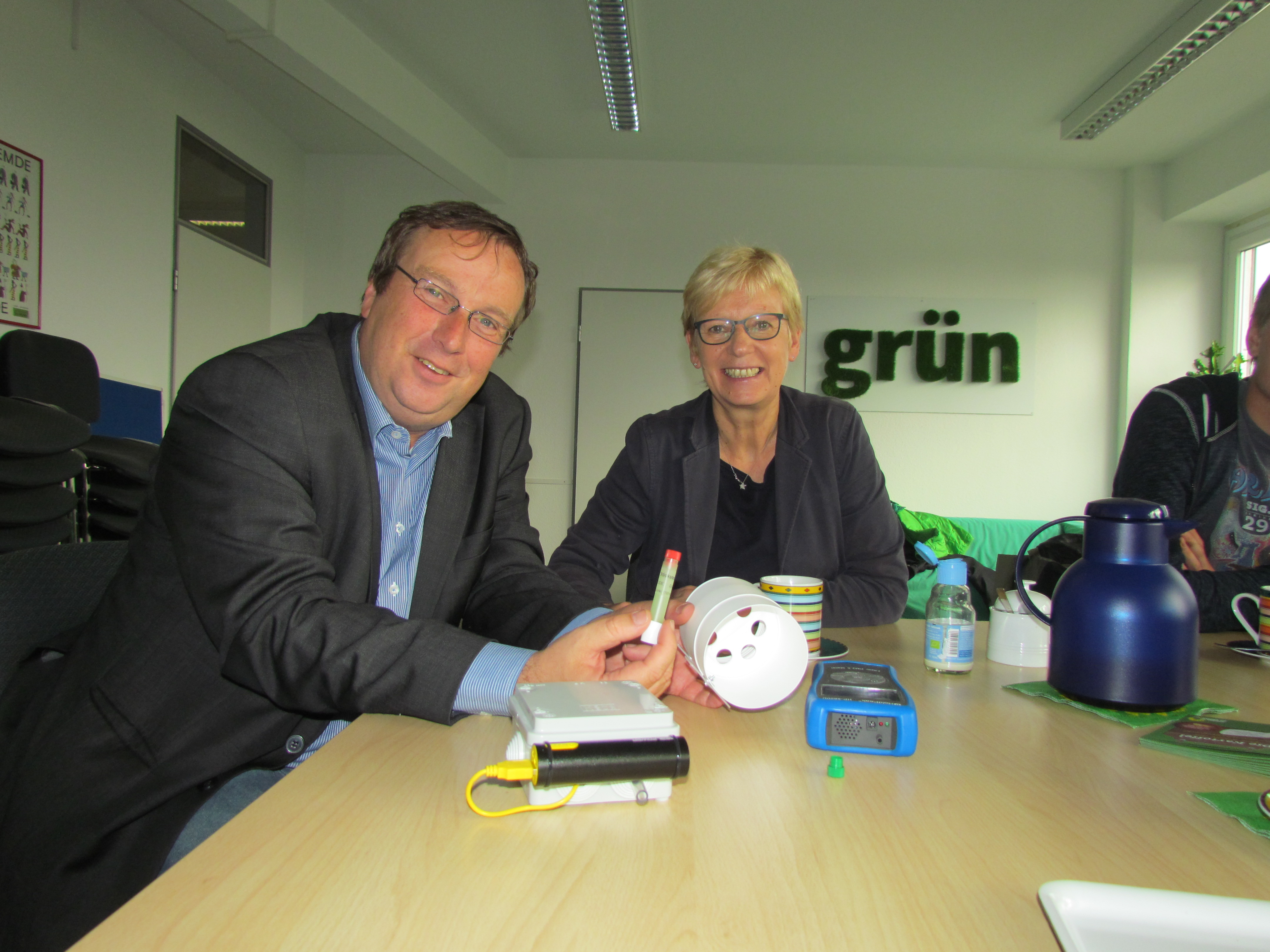 Oliver Krischer und Maria Klein-Schmeink messen Stickstoffdioxid mit eigenem Messgeräten