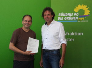 Tobis Daur vom Beratungsunternehmen lands aus Münster und GAL-Fraktionssprecher Otto Reiners trafen sich jetzt, um über die Erfahrungen mit der Zertifizierung zu sprechen. Daur merkte an, dass es für die Organisationen zunächst kein einfacher Weg sei, eine Gemeinwohlökonomie-Bilanz zu erstellen, da anhand einer Vielzahl von Indikatoren und Sub-Indikatoren das Handeln der Organisation betrachtet wird. „Aber schließlich zählt das Ergebnis. So berichtete mir vor kurzem ein zertifiziertes Dachdeckerunternehmen aus dem Münsterland, dass mit der Zertifizierung das Image gestärkt wurde.“