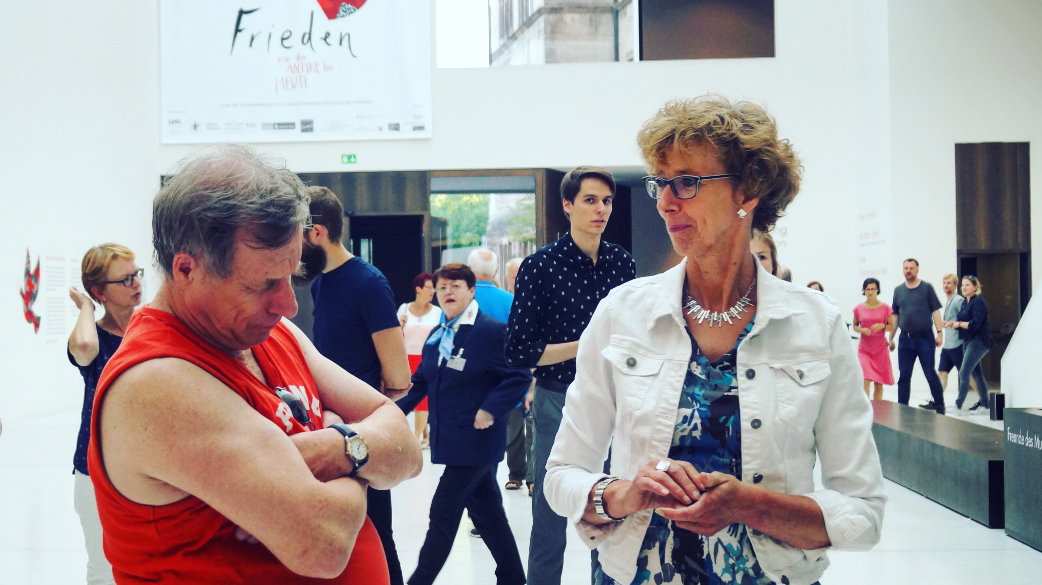 In den folgenden zwei Stunden führen engagierte Mitarbeiter des LWL Museums für Kunst und Kultur die Besucher*innen in zwei Gruppen durch die Ausstellung „Frieden. Von der Antike bis heute“. Verschiedene Impulse der beiden Inputgeber*innen begleiten die Referenten, z.B. wenn Neumann deutlich macht: Frieden ist mit dem Abschluss von Verträgen längst nicht fertig – diese Gesten seien vielmehr als der Anfang eines langen und nicht immer reibungslosen Prozesses zu verstehen.