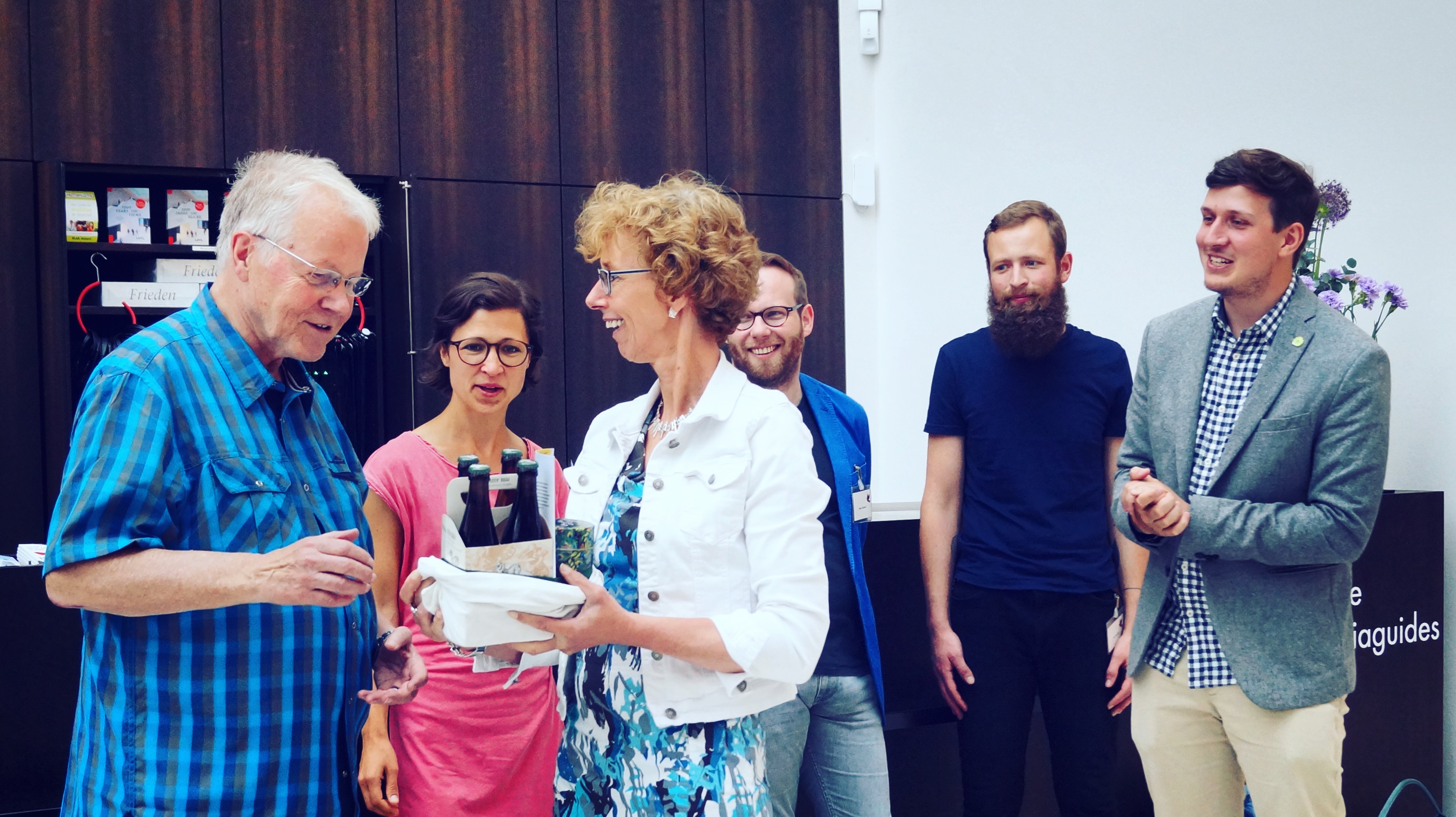 Am Ende der ca. 2 stündigen Führung bedanken sich die GRÜNE Kreisgeschäftsführerin Hildegard Termühlen und KV-Sprecher Orth bei den Referent*innen und Inputgeber*innen auf ihre Weise – mit Büchergutscheinen und ganz besonderen münsterländer Spezialitäten zum Thema Frieden, wie etwa einem besonderen ‚Friedensreiter Bräu‘.