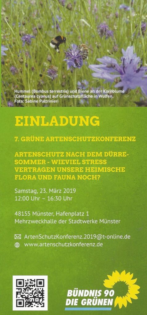Weil uns damit das Thema Artenschutz immer mehr unter den Nägeln brennt, findet nun schon zum siebten Mal die Grüne Artenschutzkonferenz der Münsterland-Kreisverbände am 23. März, Beginn 12:00 Uhr, bei den Stadtwerken Münster statt.