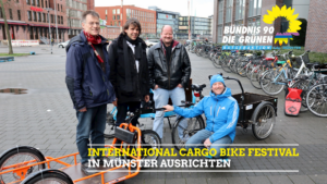 Das „International Cargo Bike Festival“ in Münster auszurichten ist Ziel eines Antrags, den Grüne und CDU in der nächsten Ratssitzung einbringen. Das Festival findet seit 2012 jährlich in Nijmegen statt – mit Abstechern in Berlin und Groningen. „Dieses Festival passt gut zu Münster als der Fahrradstadt“, ist sich unser Fraktionssprecher Otto Reiners sicher. Markt, Ausstellung und Konferenz mit Präsentationen und Workshops zu Themen wie Stadtlogistik und (E-) Cargo-Bikes: Das alles sei das „International Cargo Bike Festival“, auf dem sich Besucher*innen, Benutzer*innen, Designer*innen, Hersteller*innen und Verkäufer*innen von Fracht- und Transportfahrrädern treffen und sich gegenseitig inspirieren. Für Münster als die Fahrradstadt Deutschlands wäre das eine großartige Gelegenheit, sich mit eigenen Ideen einzubringen und als gute Gastgeberin zu präsentieren. Und Carsten Peters, verkehrspolitischer Sprecher, weist darauf hin, dass der Rat auf Antrag von Grünen und CDU die weitere Förderung für Lastenräder und deren Abstellmöglichkeiten beschlossenhat.