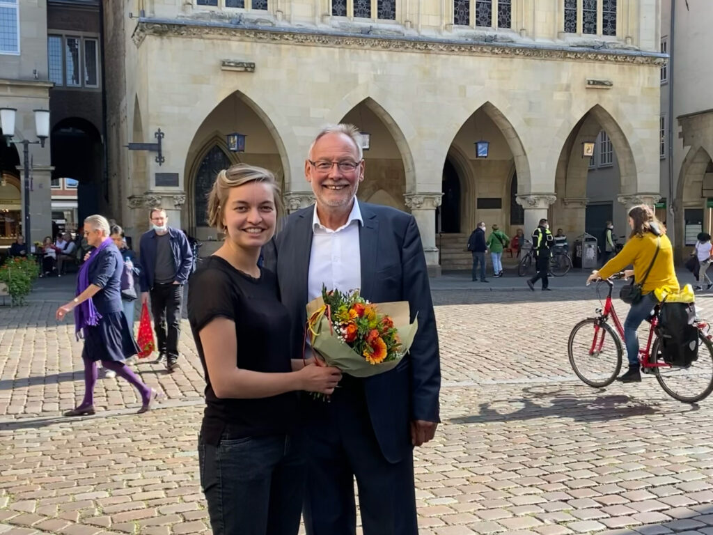 Verdiente Auszeichnung: Oberbürgermeister Markus Lewe hat am Mittwoch Gerd Joksch die Goldenen Rathaus-Gedenkmünze verliehen. Er dankte Joksch damit für seinen Einsatz als Ehrenamtlicher Bürgermeister von 2014 bis 2020. Auch die Ratsfraktion gratuliert Gerd Joksch herzlich – für den Fraktionsvorstand überreichte ihm Jule Heinz-Fischer aus dem Vorstand einen Blumenstrauß. Gerd Joksch war von 1998 bis 2006 Stadtbaurat in Münster. Von 2009 bis 2020 saß er als Ratsherr für die GRÜNEN im Stadtrat.