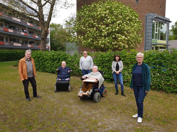 Foto (v.l.): Harald Wölter GAL-Ratsfraktion, Josef Huesmann und Norbert Siebers (Ambulante Dienste e.V.) , Dina Hamza (EUTB) und Britta Gockel (Assistenz), Maria Klein Schmeink MdB