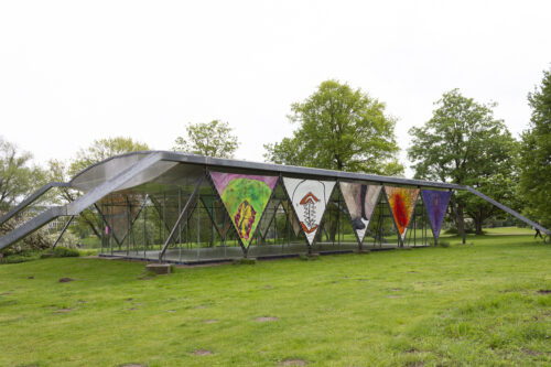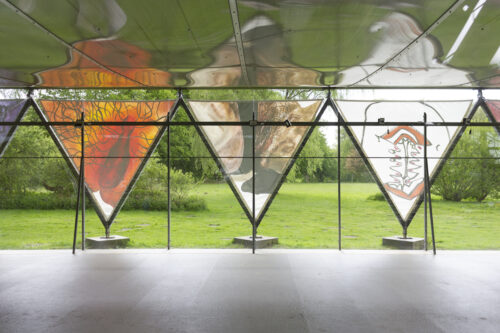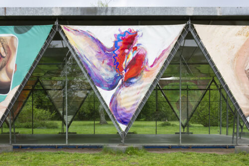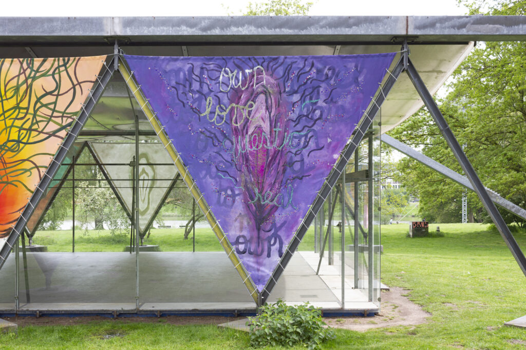 Gerne, Ausgangspunkt diesen Gesprächs war unsere Ausstellung „Vulventempel“, die im Mai/Juni 2021 am Aassee in Münster zu sehen war. Wir beide – Lisa Tschorn und Nadja Rich – haben dort gemeinsam mit acht weiteren Künstler*innen zehn großformatige, dreieckige Malereien in der Außenverstrebung des so genannten Wewerka-Pavillons installiert. Unsere Malereien zeigten Vulven, bunt, divers und verschiedenartig gemalt. Wir haben unsere Arbeit als performativen Prozess begriffen. Genauso waren daneben, vorbereitende Workshops mit der ganzen Gruppe, Teil unseres Prozesses, der immer auch ein Lernprozess ist. In diesem Sinne haben wir schon früh über die Möglichkeit nachgedacht, dass es zu Vandalismus kommen könnte und das in unser Konzept eingebunden. Auch wenn die Ausstellung jetzt verpackt im Lager liegt, dauert dieser Prozess an, auch jetzt, während wir dieses Gespräch führen und das Projekt Vulventempel ist noch lange nicht zuende.