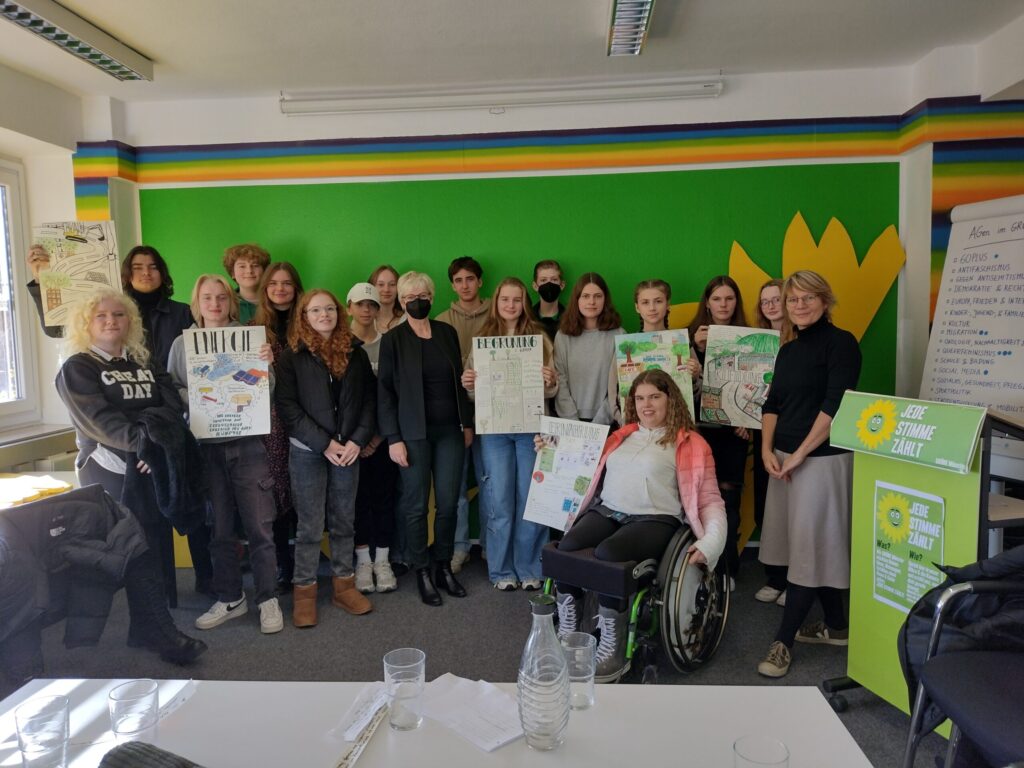 In der vergangenen Woche empfing Maria Klein-Schmeink, direkt gewählte Bundestagsabgeordnete, die 10. Klasse der Montessori-Schule Münster im Grünen Zentrum. In den Fächern Biologie und Chemie hatte Lehrerin Frau Göddeker eine Zukunftswerkstatt eingerichtet, in der die Schülerinnen und Schüler Visionen für ein klimafreundliches Leben in Münster entwickeln durften. „Ich bin sehr begeistert, wie intensiv und fachkundig sich die jungen Menschen mit Klimaschutz und gutes Leben beschäftigt haben“, sagt Maria Klein-Schmeink. Die Schülerinnen und Schüler hielten kurze Vorträge zu ihren Vorstellungen in den Bereichen Ernährung, Bau, Kleidung, Energie, Mobilität, Begrünung und Wasser. Sie fordern, dass jetzt gehandelt werde. Die stellvertretende Fraktionsvorsitzende nahm die Ideen gerne mit in den Bundestag und verwies auf die Erfolge der Grünen Ratsfraktion, die in Münster bereits viele der genannten Anregungen umsetzen würden. „Es bleibt aber noch viel zu tun und da nehme ich die jungen Leute sehr ernst.“ Zum Abschuss überreichten die Schülerinnen und Schüler der Abgeordneten noch selbst gestaltete Plakate, die im Wahlkreisbüro in der Windthorststraße ausgestellt werden sollen.
