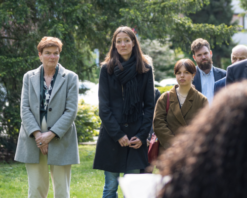 Bei einer Feierstunde in Friedenssaal und am Train-Denkmal haben am Dienstag (16.5.) Bürger*innen und Mitglieder des Stadtrats sowie der Bezirksvertretung (BV) Mitte eine Informationsstele am Denkmal eingeweiht. Veranstaltung und Stele gehen auf Anträge und Initiativen unter anderem der Grünen in BV und Kulturausschuss zurück. Entsprechend nahmen deshalb auch einige Grüne Vertreter*innen an der Feierstunde teil.