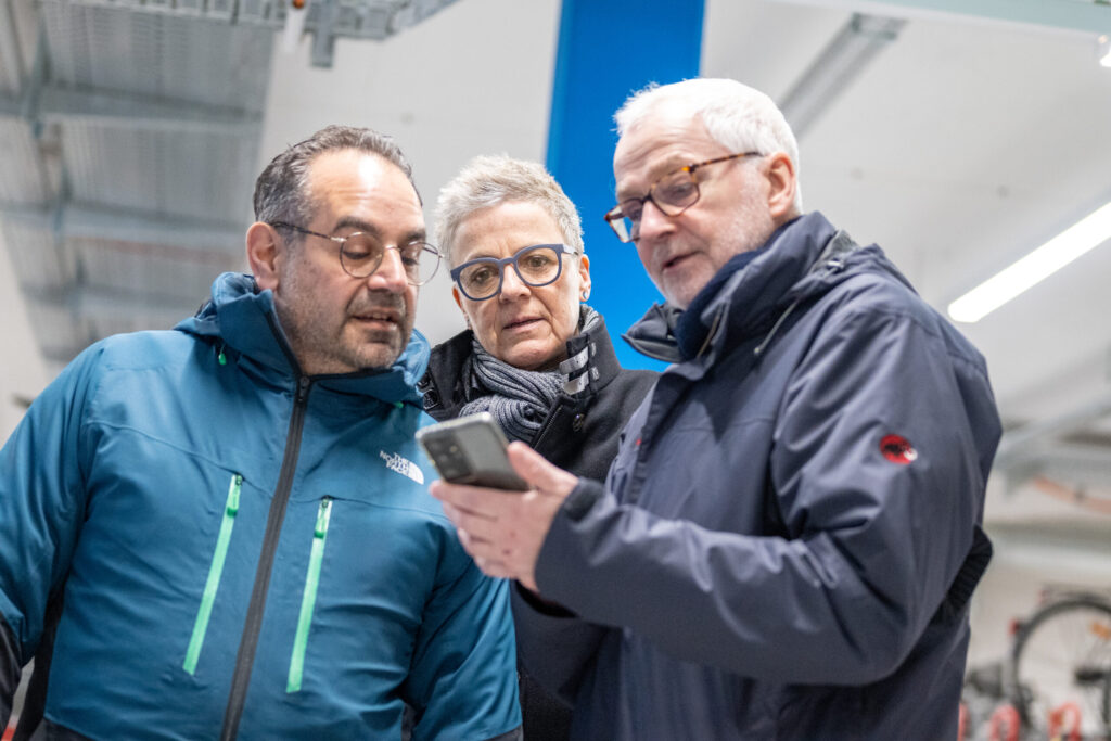 Die Grüne Fraktionsspitze hat sich vor Ort in der Radstation an der Bahnhofs-Ostseite ein Bild von der dortigen Situation gemacht. WBI-Geschäftsführer Peter Todeskino zeigte den Fraktionssprecher*innen Sylvia Rietenberg und Christoph Kattentidt die Station und erläuterte deren moderne und digitale Funktionsweise.