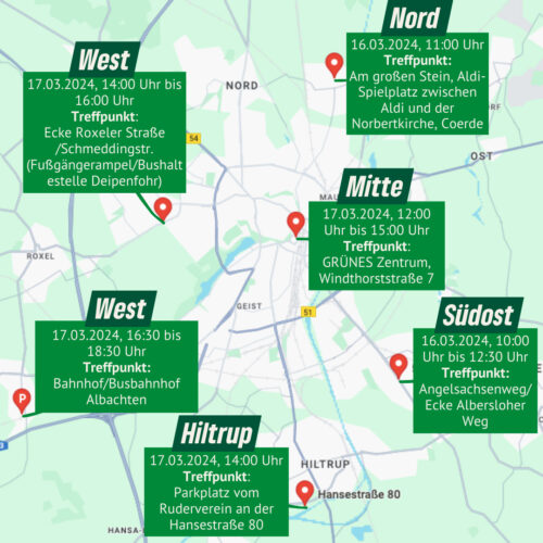 Die GRÜNEN beteiligen sich am kommenden Wochenende (16./17.03.) mit mehreren Angeboten an der Aktion „Sauberes Münster“ und laden interessierte Bürgerinnen und Bürger zum Mitmachen ein. Es sind Aktionen in Coerde, Gremmendorf, Mitte, Gievenbeck, Hiltrup und Albachten geplant. Neben der Reinigung der Stadt soll dabei je nach Sammelort auch ein Austausch mit Ortsverbänden, Arbeitsgruppen sowie Ratsmitgliedern und der Landtagsabgeordneten Dorothea Deppermann möglich sein. Weitere Infos zum Ablauf, zu genauen Treffpunkten und Zeiten: https://gruene-muenster.de/termin/aktion-sauberes-muenster/ oder Tel.: 0251/8995820.