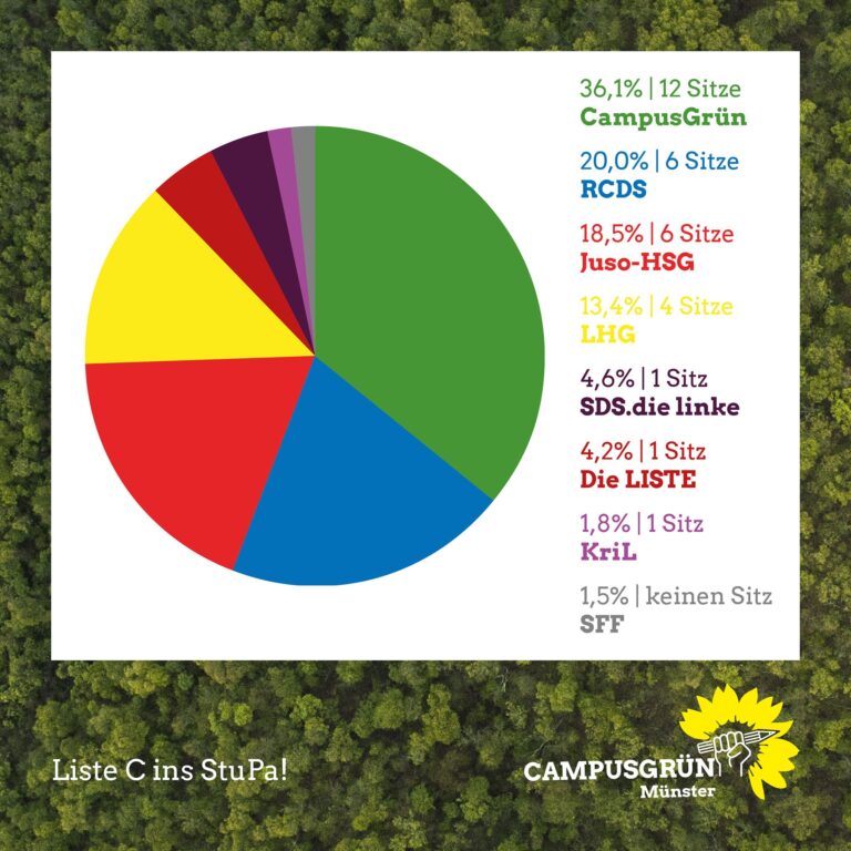 Die grüne Hochschulgruppe CampusGrün hat die Wahl für das Studierendenparlament der Universität Münster gewonnen. Mit 36,1 % (2019: 30,6 %) ist CampusGrün die stärkste Kraft deutlich vor dem Ring Christlich-Demokratischer…