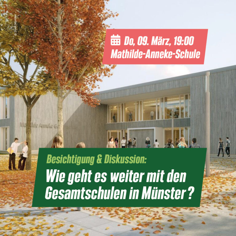 Die Grüne Schul-AG lädt für den kommenden Donnerstag (09.03.) zu einer öffentlichen Veranstaltung zum Thema Gesamtschulen in Münster ein. Um 19 Uhr startet ein Rundgang durch die Mathilde-Anneke-Gesamtschule. Schulleiterin Birgit…
