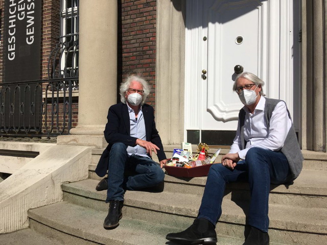 Anlässlich seiner Verabschiedung am Mittwoch im Kulturausschuss überbrachte Wilhelm Breitenbach im Auftrag der grünen Kultur-AG coronakonform Christoph Spieker einen Präsentkorb aus dem Bioladen. 18 Jahre leitete Spieker die Villa ten…
