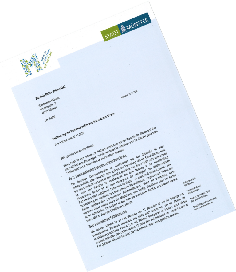 „Die Verwaltung hält die Anregungen zur Verbesserung der Radverkehrsführung an der Warendorfer Straße für nachvollziehbar“, freut sich Ingrid Kremer, Ratsfrau der Grünen für das Mauritzviertel. „Wir sind zuversichtlich, dass die…